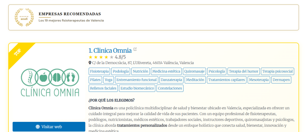 El mejor fisioterapeuta en Valencia está en la clínica Omnia. Contamos con un equipo médico cualificado que se encargará de darte un diagnóstico personalizado para mejorar tus problemas de salud. Gracias a la formación cualificada de nuestros fisioterapeutas, conseguirás mejorar tu salud y recuperar parte de tu estilo de vida. Te animamos a que visites al completo nuestra página web y puedas comprobar por qué tenemos el mejor fisioterapeuta en Valencia.